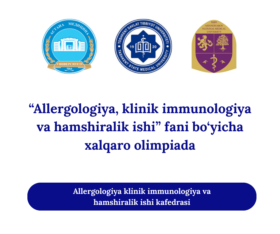 TOSHKENT DAVLAT TIBBIYOT UNIVERSITETI Allergologiya, klinik immunologiya va hamshiralik ishi kafedrasi “Allergologiya, klinik immunologiya va hamshiralik ishi” fani bo‘yicha xalqaro olimpiada AXBOROT XATI Hurmatli talabalar! Sizlarni Toshkent davlat tibbiyot universiteti “Allergologiya, klinik immunologiya va hamshiralik ishi” kafedrasida tashkil etilayotgan «“Allergologiya, klinik immunologiya va hamshiralik ishi” fani bo‘yicha xalqaro olimpiadaga taklif etamiz! Olimpiadada 4-5-6 bosqich…